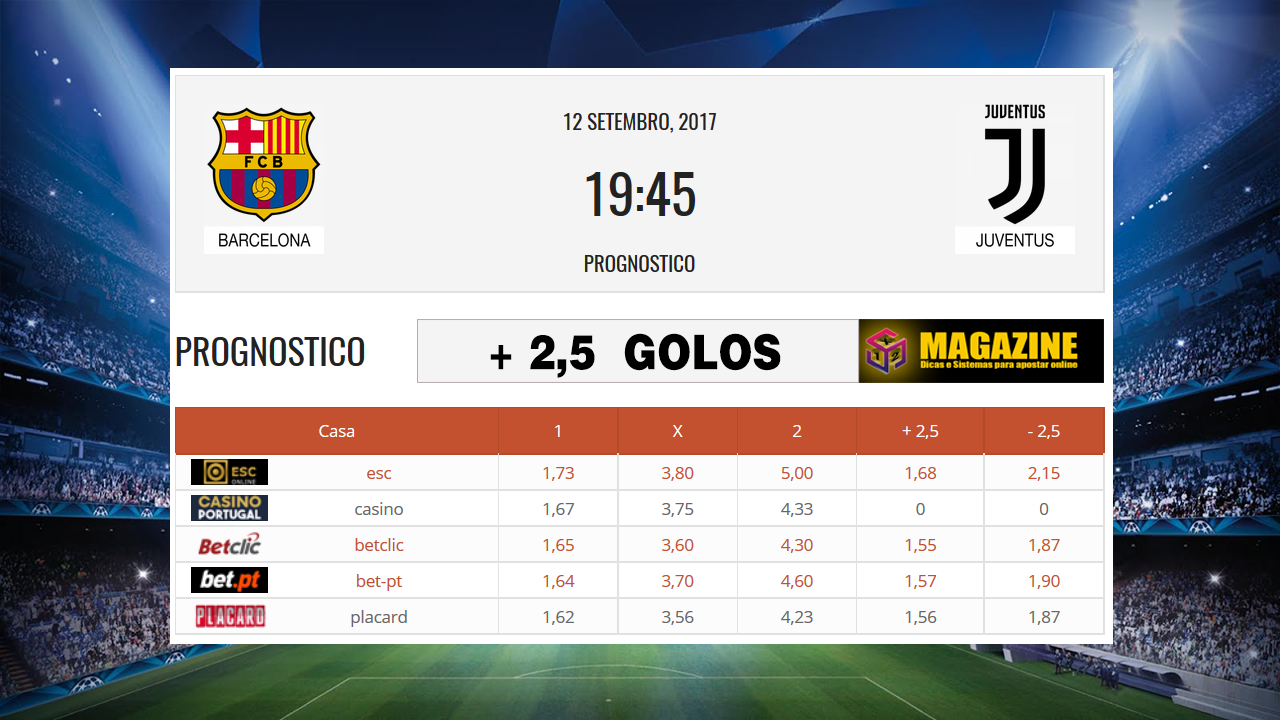 Barcelona – Juventus 0 4 12 Setembro 2017 0 - 3 Final Jogo Resumo[lt id=”58″] [totalpoll id=”4980″] Detalhes Data Hora Liga Temporada 12 Setembro 2017 19:45 Champions Grupo D 2017-18 Campo Camp Nou Travessera de les Corts, 73, 08028 Barcelona, Espanha ResultadosClube1ºT2ºTGolosResultadoJuventus000DerrotaBarcelona123Vitoria